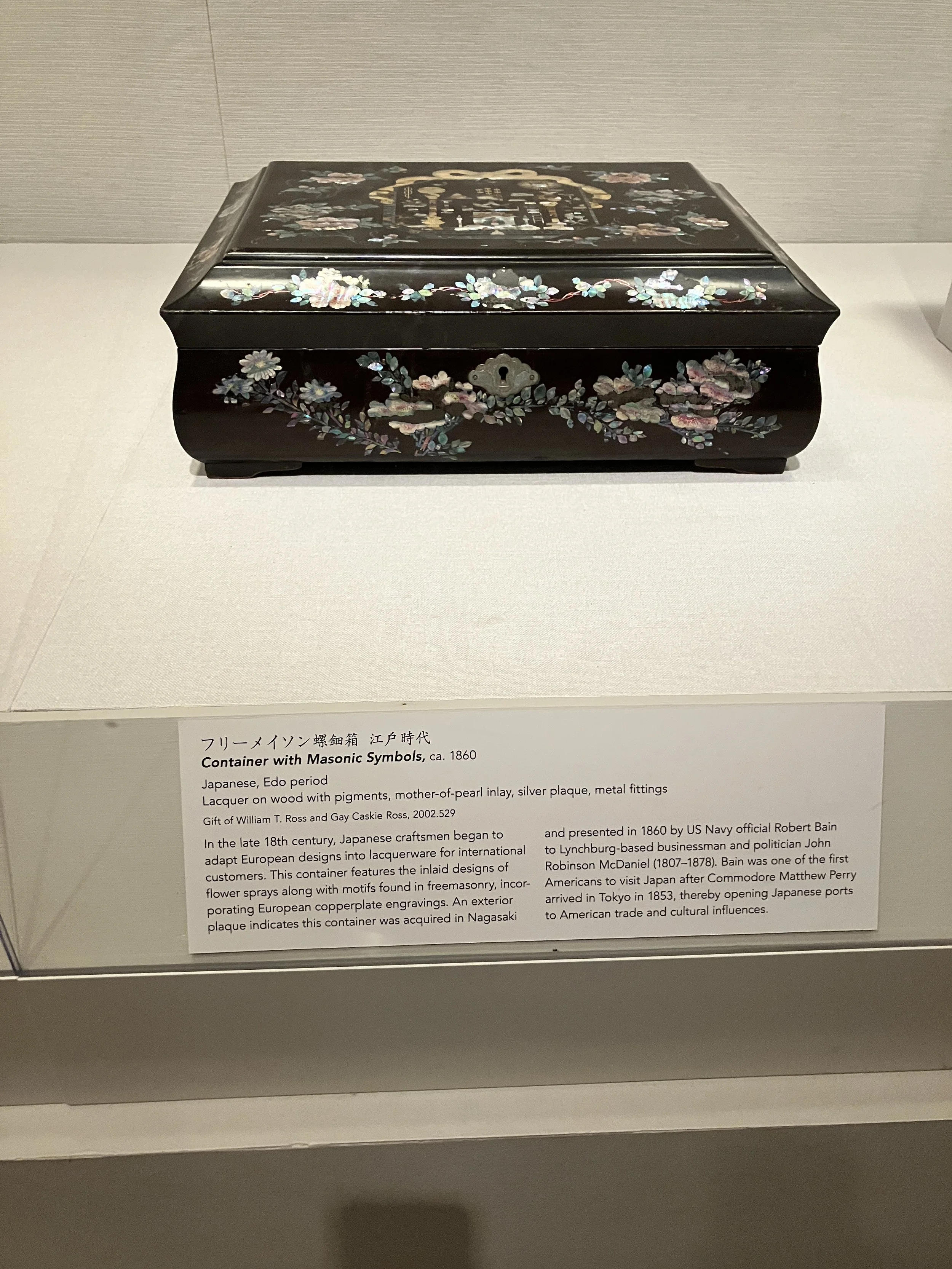 Here is a beautiful Japanese box gifted to a politician from Lynchburg in 1860 who was one of the first Americans to visit Japan. So, of course it has Masonic symbols.